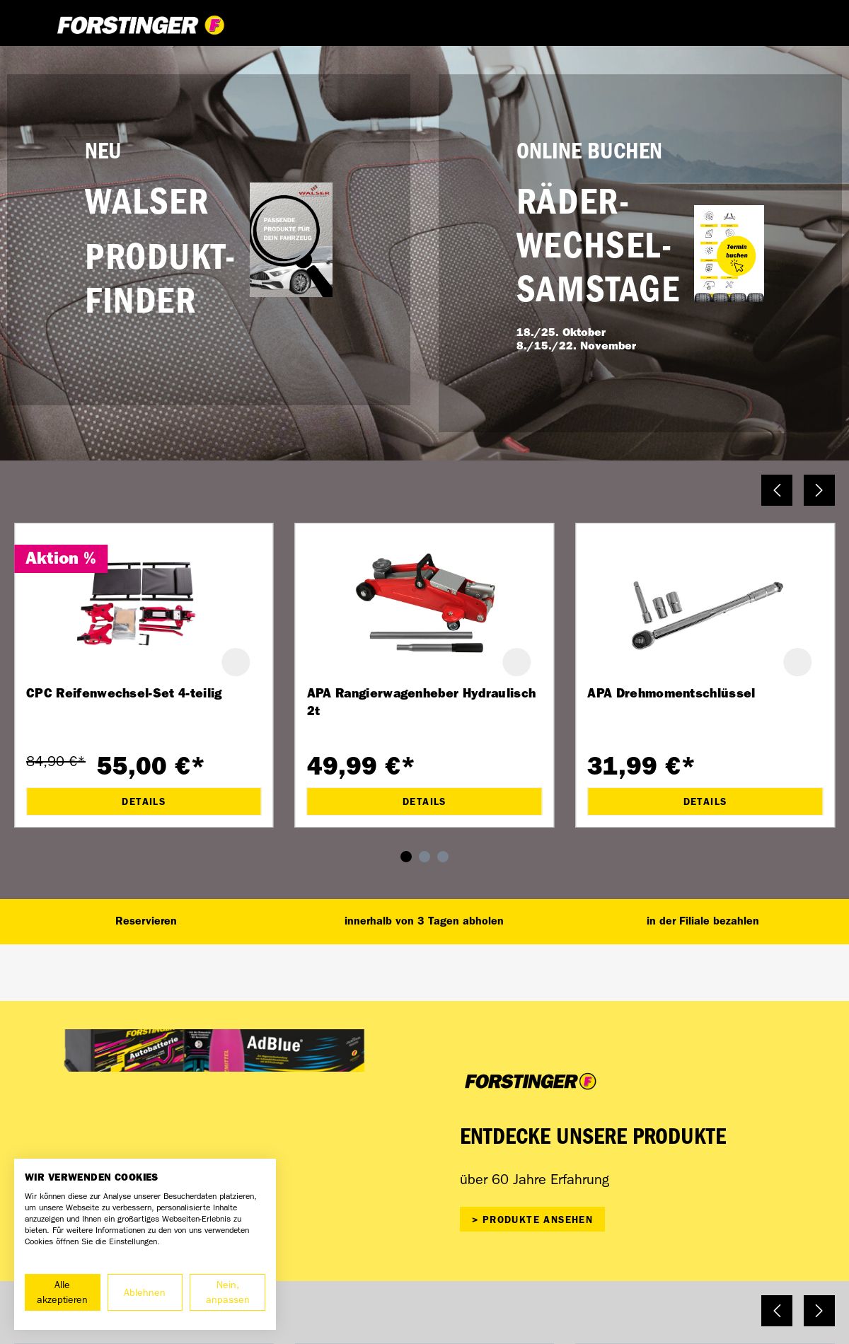 Zum Hauptinhalt springen Zur Suche springen Zur Hauptnavigation springen NEU WALSER PRODUKT- FINDER ONLINE BUCHEN RÄDER- WECHSEL- SAMSTAGE 18./25. Oktober 8./15./22. November slide 5 to 7 WBF Feuerlöscher ABC 2 kg 27,99 €* DETAILS BGS TECHNIC Druckluft-Reifenfüllpistole 0-8 bar 21,99 €* DETAILS CPC L17 Ausbildungsfahrt 2 Stk. wiederverwendbar 17,99 €* DETAILS Aktion % CPC Felgenbaum 15,00 €* 29,99 €* DETAILS Aktion % CPC Reifenwechsel-Set 4-teilig 55,00 €* 84,90 €* DETAILS APA Rangierwagenheber Hydraulisch 2t 49,99 €* DETAILS APA Drehmomentschlüssel 31,99 €* DETAILS WBF Feuerlöscher ABC 2 kg 27,99 €* DETAILS BGS TECHNIC Druckluft-Reifenfüllpistole 0-8 bar 21,99 €* DETAILS CPC L17 Ausbildungsfahrt 2 Stk. wiederverwendbar 17,99 €* DETAILS Aktion % CPC Felgenbaum 15,00 €* 29,99 €* DETAILS Aktion % CPC Reifenwechsel-Set 4-teilig 55,00 €* 84,90 €* DETAILS APA Rangierwagenheber Hydraulisch 2t 49,99 €* DETAILS APA Drehmomentschlüssel 31,99 €* DETAILS WBF Feuerlöscher ABC 2 kg 27,99 €* DETAILS Reservieren innerhalb von 3 Tagen abholen in der Filiale bezahlen ENTDECKE UNSERE PRODUKTE über 60 Jahre Erfahrung > PRODUKTE ANSEHEN slide 4 to 6 FORSTINGER Motorhaube schwarz 15,00 €* DETAILS Neu FORSTINGER Reifenreparaturset 53-teilig 13,99 €* DETAILS FORSTINGER Scheibenreiniger YellowFresh 8,99 €* DETAILS FORSTINGER AdBlue® 10 L Ab 9,99 €* DETAILS FORSTINGER AGM FO56001 Start/Stop 12V 60Ah 209,00 €* DETAILS FORSTINGER AGM FO58001 Start/Stop 12V 80Ah 249,00 €* DETAILS FORSTINGER Autopflegeset im Kübel 8-tlg. 24,99 €* DETAILS FORSTINGER Behälter "Frostschutzmittel" 14,90 €* DETAILS FORSTINGER Behälter "Kühlflüssigkeit" 14,90 €* DETAILS FORSTINGER Behälter "Reservetank" 14,90 €* DETAILS FORSTINGER Bremsenreiniger 750 ml 4,29 €* DETAILS FORSTINGER Clear Amber Scheibenreiniger 8,99 €* DETAILS FORSTINGER FO54409 12V 44Ah 83,90 €* DETAILS FORSTINGER FO55003 12V 55Ah 99,90 €* DETAILS FORSTINGER FO56009 12V 60Ah 114,90 €* DETAILS FORSTINGER FO56060 12V 60Ah 114,90 €* DETAILS FORSTINGER FO57044 12V 70Ah 134,90 €* DETAILS FORSTINGER FO57070 12V 70Ah 134,90 €* DETAILS FORSTINGER FO58014 12V 80Ah 134,90 €* DETAILS FORSTINGER FO59090 12V 90Ah 179,00 €* DETAILS FORSTINGER FO59504 12V 95Ah 179,00 €* DETAILS FORSTINGER Hydraulik Wagenheber 4t 23,99 €* DETAILS FORSTINGER Hydraulikwagenheber 6 t 29,99 €* DETAILS FORSTINGER Mikrofasertuch 40x60 cm 7,99 €* DETAILS FORSTINGER Motorhaube gelb 15,00 €* DETAILS FORSTINGER Motorhaube rosa 15,00 €* DETAILS FORSTINGER Motorhaube schwarz 15,00 €* DETAILS Neu FORSTINGER Reifenreparaturset 53-teilig 13,99 €* DETAILS FORSTINGER Scheibenreiniger YellowFresh 8,99 €* DETAILS FORSTINGER AdBlue® 10 L Ab 9,99 €* DETAILS FORSTINGER AGM FO56001 Start/Stop 12V 60Ah 209,00 €* DETAILS FORSTINGER AGM FO58001 Start/Stop 12V 80Ah 249,00 €* DETAILS WERKSTATTSERVICE 68x IN ÖSTERREICH Alles rund um Reifen, Bremsen, Klima, Windschutzscheibe, Pickerl, Service, Ölwechsel uvm > TERMIN BUCHEN Terminbuchung Online rund um die Uhr 68 Fachwerkstätten in Österreich laufend attraktive Angebote Reifen Chemie & Pflege Autozubehör Öle & Additive Angebote direkt in dein Postfach NEWSLETTER ABONNIEREN Exklusive Aktionen und Jahresbonus sichern! IN DER FILIALE ANMELDEN Produkte Auto Reifen Moped Fahrrad Sortiment Werkstattservice Fachwerkstatt finden Termin vereinbaren FAQ Terminbuchung Online Service Online bestellen Versand und Lieferung Widerrufsrecht Retoure anmelden Click & Collect Altölentsorgung Deine Vorteile Vorteilskarte Business Vorteilskarte Teilzahlung Reifenversicherung Bestpreisgarantie FORSTINGER Über uns Ratgeber/Blog Presse Karriere Jobs Lehre AGBImpressumDatenschutzHinweisgebersystemBarrierefreiheitserklärungKontakt * Alle Preise inkl. gesetzl. Mehrwertsteuer zzgl. Versandkosten und ggf. Nachnahmegebühren, wenn nicht anders angegeben. Copyright 2025 Forstinger Österreich GmbH Königstetter Straße 128 - 134/OG3, 3430 Tulln Nach geltendem Recht ist Forstinger verpflichtet, seine Kunden auf die Existenz der europäschen Online-Streitbeilegungs-Plattform hinzuweisen: webgate.ec.europa.eu/odr WIR VERWENDEN COOKIES Wir können diese zur Analyse unserer Besucherdaten platzieren, um unsere Webseite zu verbessern, personalisierte Inhalte anzuzeigen und Ihnen ein großartiges Webseiten-Erlebnis zu bieten. Für weitere Informationen zu den von uns verwendeten Cookies öffnen Sie die Einstellungen. Alle akzeptieren Ablehnen Nein, anpassen