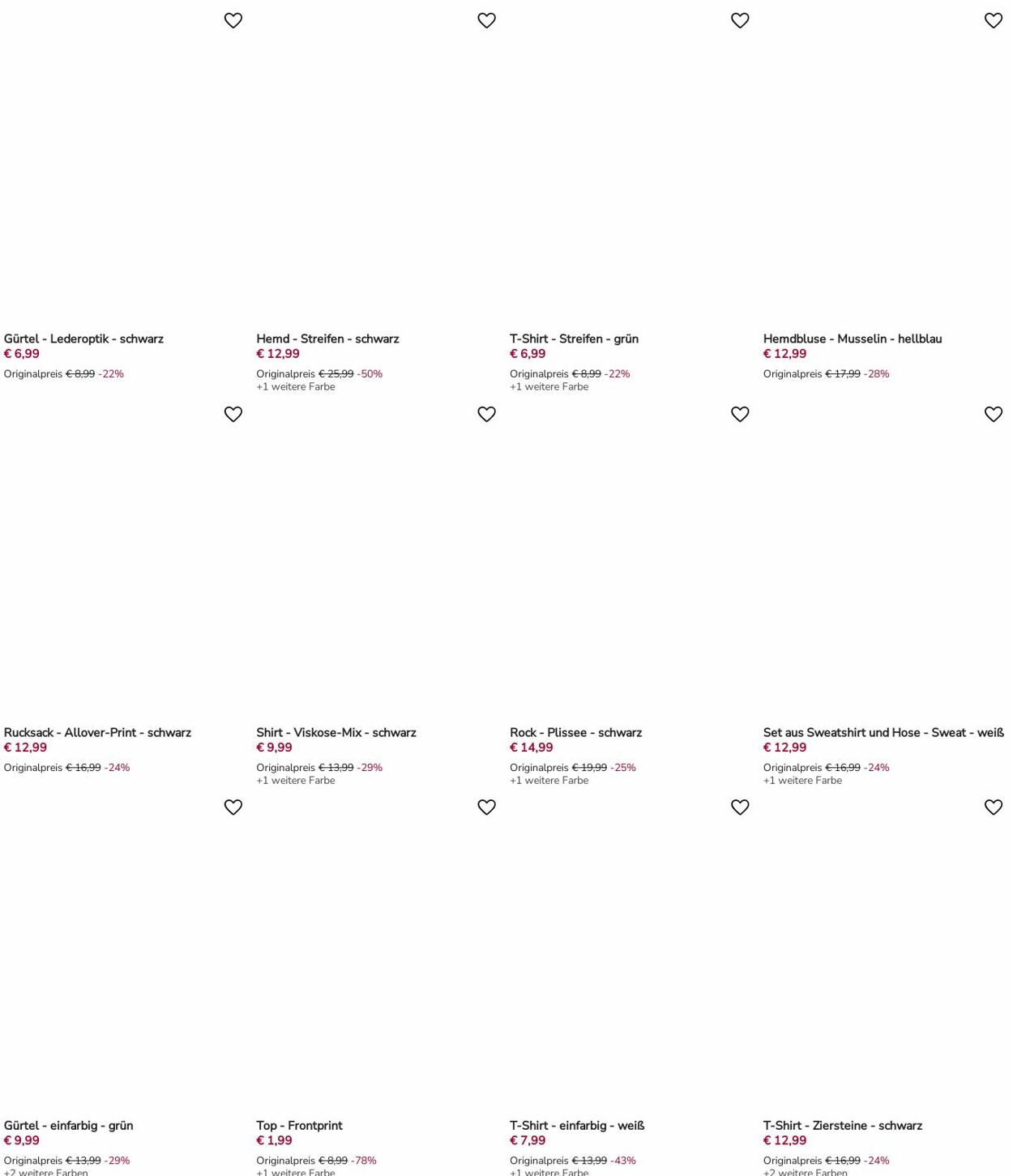 Gürtel - Lederoptik - schwarz -22% 3für2 Sale Artikel** € 6,99 Originalpreis € 8,99 -22% Hemd - Streifen - schwarz -50% 3für2 Sale Artikel** € 12,99 Originalpreis € 25,99 -50% +1 weitere Farbe T-Shirt - Streifen - grün -22% 3für2 Sale Artikel** € 6,99 Originalpreis € 8,99 -22% +1 weitere Farbe Hemdbluse - Musselin - hellblau -28% 3für2 Sale Artikel** € 12,99 Originalpreis € 17,99 -28% Rucksack - Allover-Print - schwarz -24% 3für2 Sale Artikel** € 12,99 Originalpreis € 16,99 -24% Shirt - Viskose-Mix - schwarz -29% 3für2 Sale Artikel** € 9,99 Originalpreis € 13,99 -29% +1 weitere Farbe Rock - Plissee - schwarz -25% 3für2 Sale Artikel** € 14,99 Originalpreis € 19,99 -25% +1 weitere Farbe Set aus Sweatshirt und Hose - Sweat - weiß -24% 3für2 Sale Artikel** € 12,99 Originalpreis € 16,99 -24% +1 weitere Farbe Gürtel - einfarbig - grün -29% 3für2 Sale Artikel** € 9,99 Originalpreis € 13,99 -29% +2 weitere Farben Top - Frontprint -78% 3für2 Sale Artikel** € 1,99 Originalpreis € 8,99 -78% +1 weitere Farbe T-Shirt - einfarbig - weiß -43% 3für2 Sale Artikel** € 7,99 Originalpreis € 13,99 -43% +1 weitere Farbe T-Shirt - Ziersteine - schwarz -24% 3für2 Sale Artikel** € 12,99 Originalpreis € 16,99 -24% +2 weitere Farben