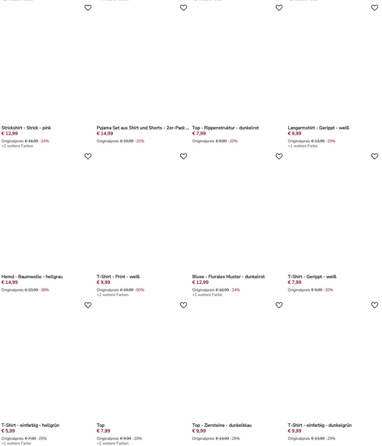 Strickshirt - Strick - pink -24% 3für2 Sale Artikel** € 12,99 Originalpreis € 16,99 -24% +2 weitere Farben Pyjama Set aus Shirt und Shorts - 2er-Pack - dunkelgrün -25% 3für2 Sale Artikel** € 14,99 Originalpreis € 19,99 -25% Top - Rippenstruktur - dunkelrot -20% 3für2 Sale Artikel** € 7,99 Originalpreis € 9,99 -20% Langarmshirt - Gerippt - weiß -29% 3für2 Sale Artikel** € 9,99 Originalpreis € 13,99 -29% +1 weitere Farbe Hemd - Baumwolle - hellgrau -38% 3für2 Sale Artikel** € 14,99 Originalpreis € 23,99 -38% T-Shirt - Print - weiß -50% 3für2 Sale Artikel** € 9,99 Originalpreis € 19,99 -50% +2 weitere Farben Bluse - Florales Muster - dunkelrot -24% 3für2 Sale Artikel** € 12,99 Originalpreis € 16,99 -24% +1 weitere Farbe T-Shirt - Gerippt - weiß -20% 3für2 Sale Artikel** € 7,99 Originalpreis € 9,99 -20% T-Shirt - einfarbig - hellgrün -25% 3für2 Sale Artikel** € 5,99 Originalpreis € 7,99 -25% +1 weitere Farbe Top -20% 3für2 Sale Artikel** € 7,99 Originalpreis € 9,99 -20% +2 weitere Farben Top - Ziersteine - dunkelblau -29% 3für2 Sale Artikel** € 9,99 Originalpreis € 13,99 -29% T-Shirt - einfarbig - dunkelgrün -29% 3für2 Sale Artikel** € 9,99 Originalpreis € 13,99 -29%